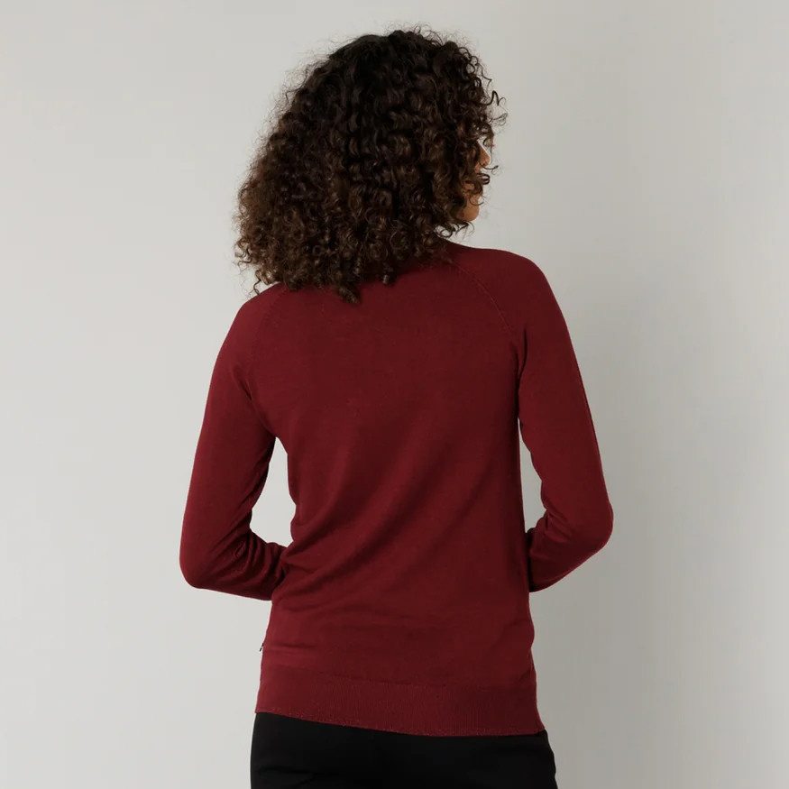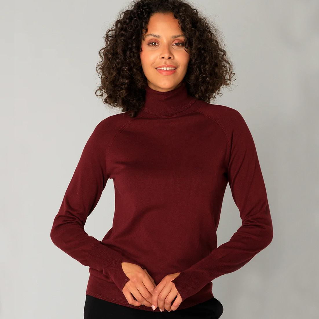 The Ojasvini top Port from Yest is a refined essential with subtle shimmer and effortless comfort. Crafted from a thin, finely knitted viscose-nylon blend, it offers a smooth, soft finish that feels lightweight against the skin. The classic turtleneck adds a timeless touch, making it perfect for layering or wearing on its own. Delicate lurex glitter trim along the sleeves, hem, and turtleneck brings a hint of understated sparkle, elevating the look without overpowering it. Designed with raglan sleeves, this top provides extra comfort and ease of movement while maintaining a sleek silhouette.
