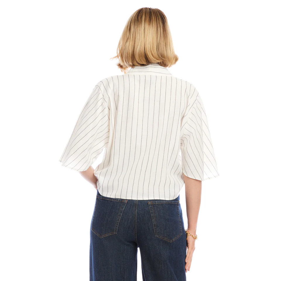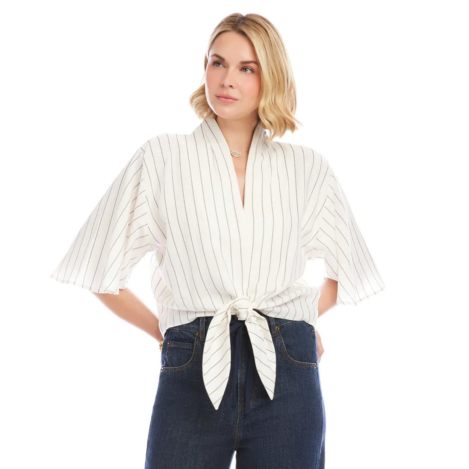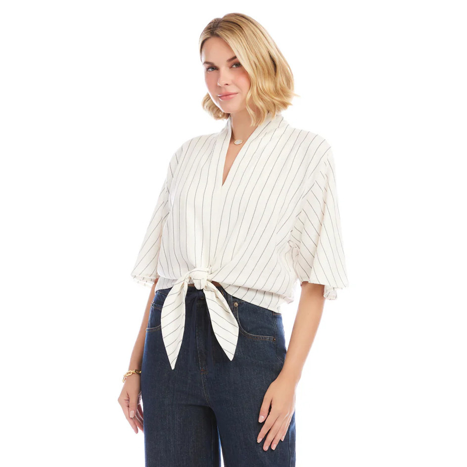Effortlessly polished with a relaxed coastal feel, this linen-blend striped top from Karen Kane is designed for warm days and easy styling. The breathable fabric offers a light, airy drape, while the subtle vertical stripes create a flattering, elongated silhouette. A softly tailored V-neckline frames the face, and breezy flare sleeves with a slightly dropped shoulder add movement and modern ease. The tie-front detail defines the waist and lends a casually chic finish, making it perfect to pair with tailored trousers, denim, or flowy skirts for a refined yet relaxed look.