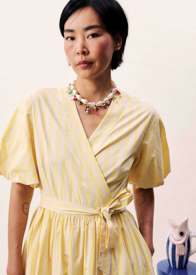 Light, feminine, and effortlessly elegant, the Queen Butter dress is a modern take on a timeless silhouette. Crafted in a soft yellow and white vertical stripe, it brings a fresh, sunlit feel to everyday dressing. Designed with a flattering wrap-style bodice, this midi dress features a crossover V-neckline and softly structured short sleeves for a relaxed yet polished look. The matching belt cinches at the waist, creating a beautifully defined shape, while the flared skirt adds graceful movement with every step. Perfect for warm days or casual gatherings, this dress combines comfort and charm with its airy feel and classic design—an easy go-to piece that feels as good as it looks.
